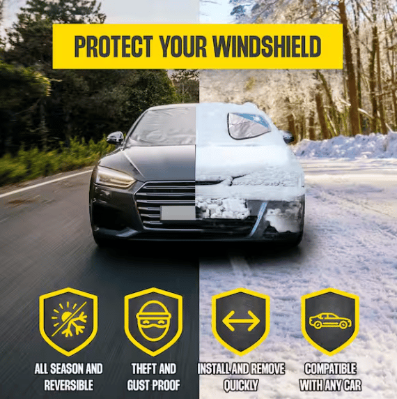 With theft-proof securitypanels,gust-resistant magnets, and a universal fit, the Windshield Protector is the perfect companion for everyvehicle,every season.Tear-proof, machine washable and easy to fold for compact storage, it's the ultimatesolution for maintaining a clean and protected windshieldIn any weather condition.