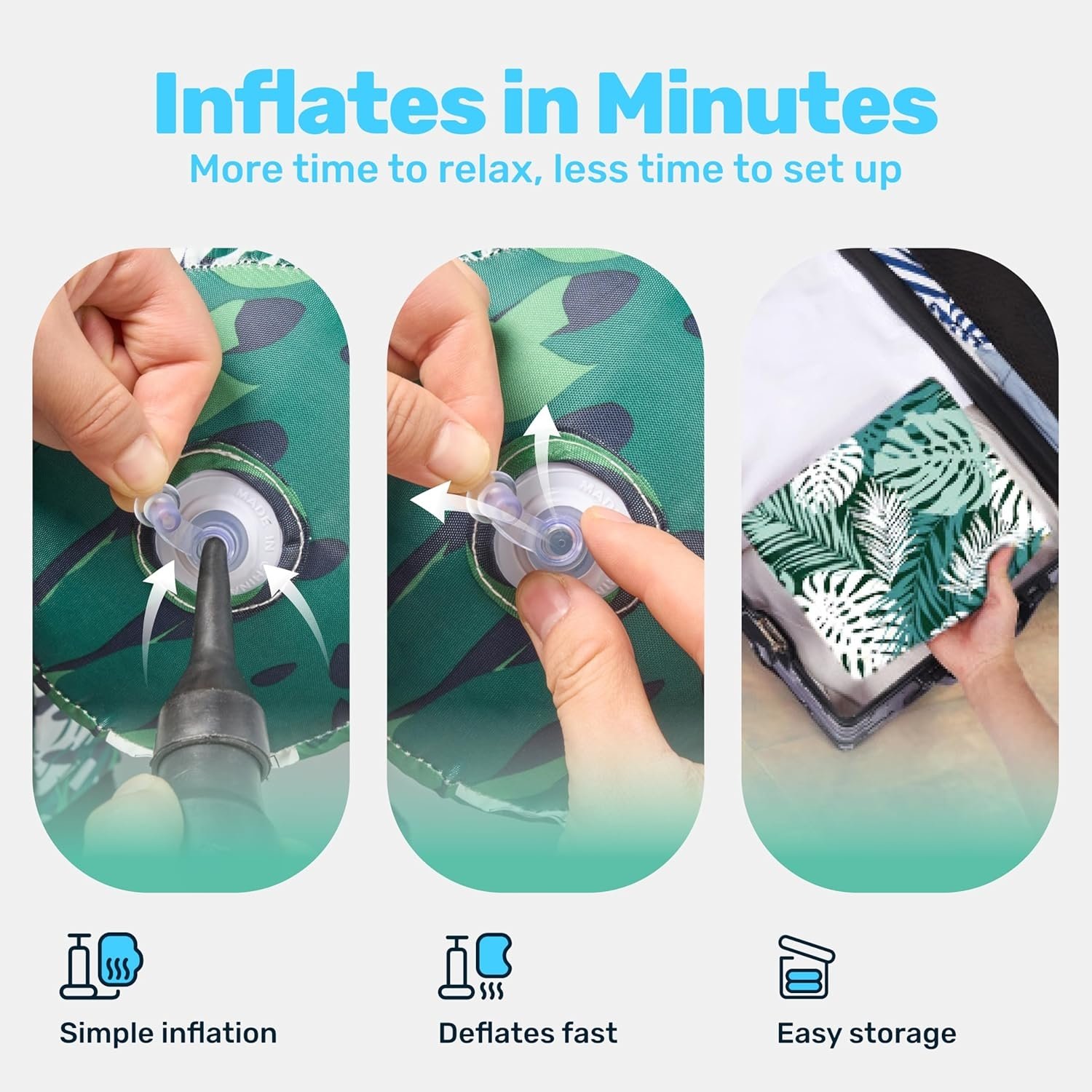 TROPICAL LEAF DESIGN + DUAL PUMP OPTIONS - Drift in style with vibrant Blue or Green Leaf prints. Choose a hand pump for quick inflation or a foot pump for hands-free setup. Beach-ready aesthetics meet practicality—transform your pool, lake, or backyard into a tropical oasis in minutes.