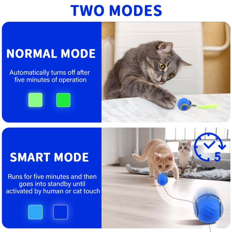 Choose between Normal Mode and Smart Mode. In Normal Mode, the ball runs for 5 minutes and then shuts off. In Smart Mode, it runs for 5 minutes and then enters standby until reactivated by a cat’s touch. Never worry about turning the toy off manually!