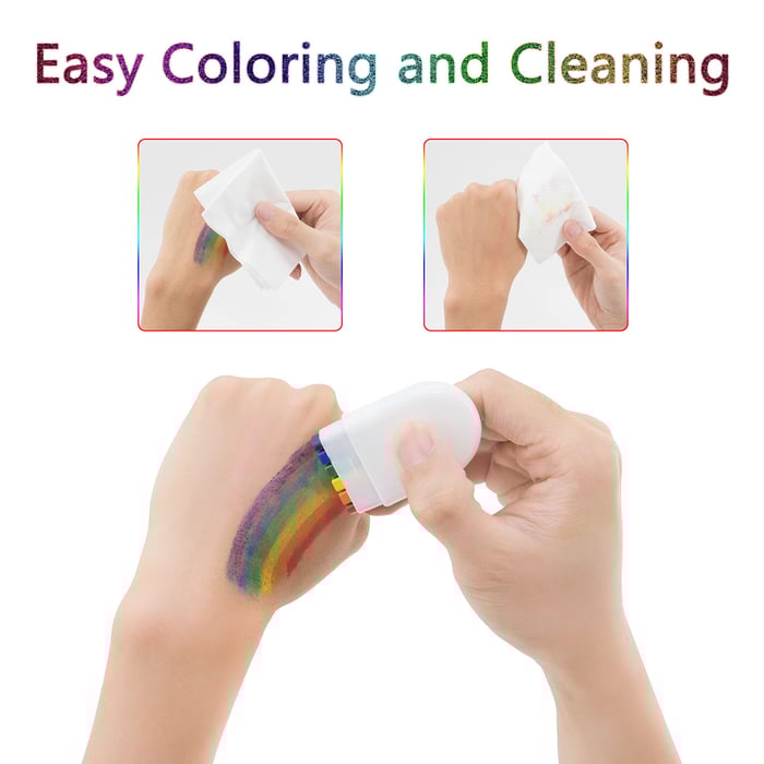 Our Rainbow Face Body Paint is made with premium materials for a smooth, the face paint applies smoothly and lasts well, vibrant application that lasts and is sweat-resistant. For best results, we recommend using it with setting powder.